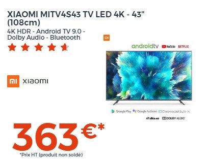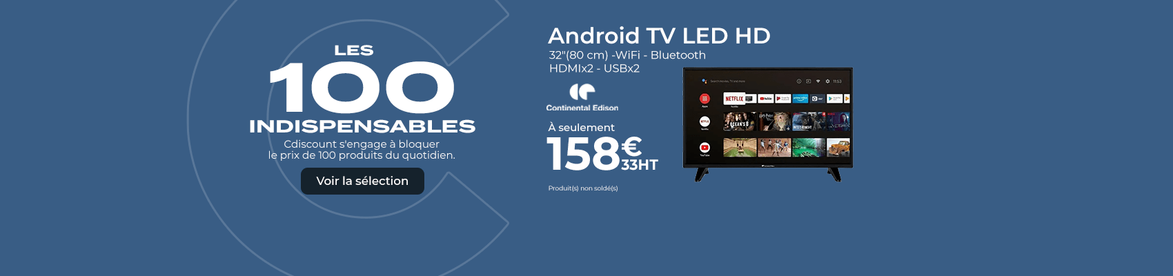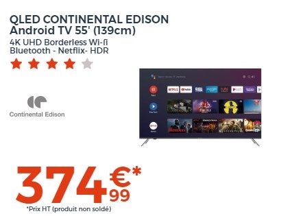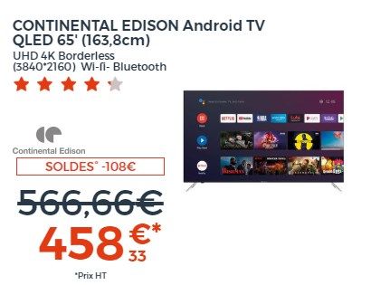 549€99 458€33 HT 679,99€ 566,66€HTSoldesCONTINENTAL EDISON Android TV QLED 65' (163,8cm) UHD 4K Borderless (3840*2160) Wi-fi- Bluetooth Netflix- HDR -Google Assitant -(23)-108€ HT SOLDES