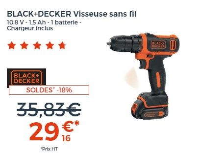 99€99 83€33 HT 188,63€ 157,19€HTSélection shoppingBLACK+DECKER BCK186D2KA-QW Perceuse-Visseuse sans fil - 18 V - 2 batteries 2 Ah - 120 Accessoires - Livrée en boite à outil73€ HT d'économie