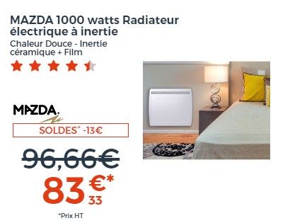 59€99 49€99 HT5% à cagnotterOCEANIC 1000 Watts Rubis Radiateur électrique fixe à inertie sèche - Design galbé - Blanc - NF(78)